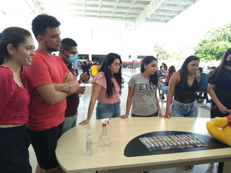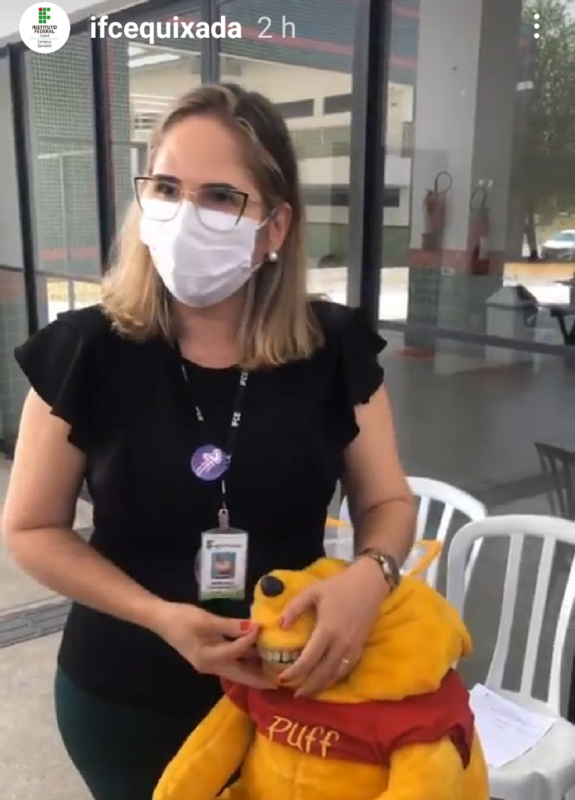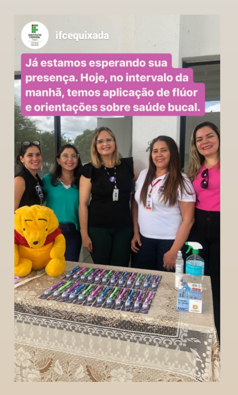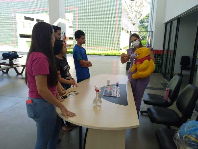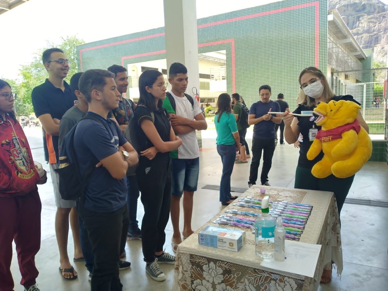 Foi realizado orientação sobre cuidados com a higiene bucal com entrega de escova e aplicação de flúor na área de convivência do campus, reunindo os alunos que estavam naquele ambiente no horário do intervalo das aulas.