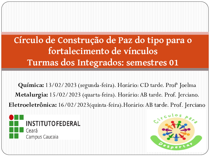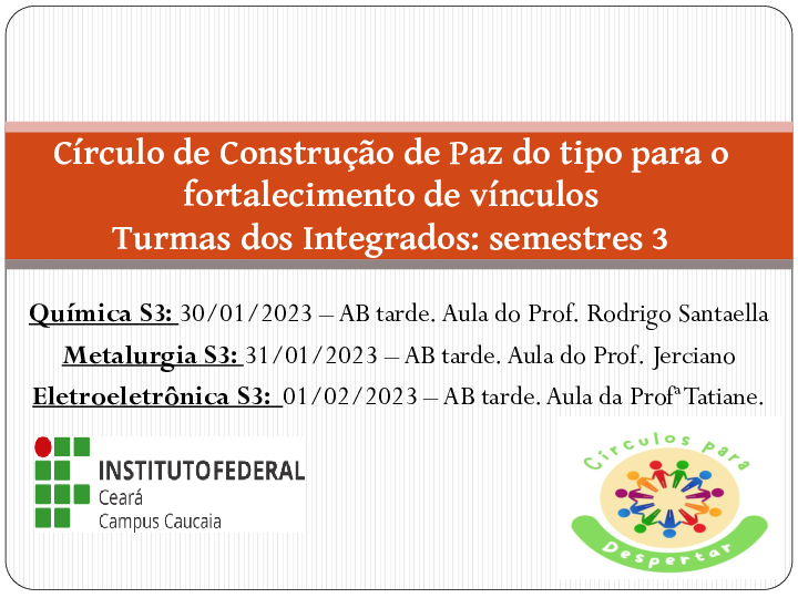 SISTEMÁTICA DAS ATIVIDADES: Na primeira semana de aula, foram realizados Círculos de Construção de Paz nas turmas dos S3 tendo a seguinte temática "Projetando minhas metas acadêmicas para o ano letivo de 2023". Na segunda semana e terceira semana de aula foram realizados dois círculos, em cada turma ingressante dos Cursos Técnicos Integrados, tendo as respectivas temáticas: "Círculo para criar uma sala de aula segura e feliz" e "O que te preocupa na sua vida acadêmica?". No encontro Pedagógico 2023.1 foi realizado um Círculo de Construção de Paz do tipo de fortalecimento dos vínculos de trabalho com os servidores técnicos administrativos em educação e docentes.