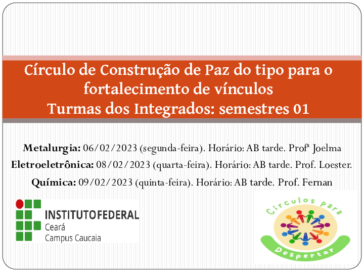 Ao logo do semestre 2023.1 e 2023.2 os bolsista com auxílio formação, vinculados ao Projeto Círculos para Despertar darão continuidade as ações realizando a monitoria com os alunos dos Cursos Técnicos Integrados.