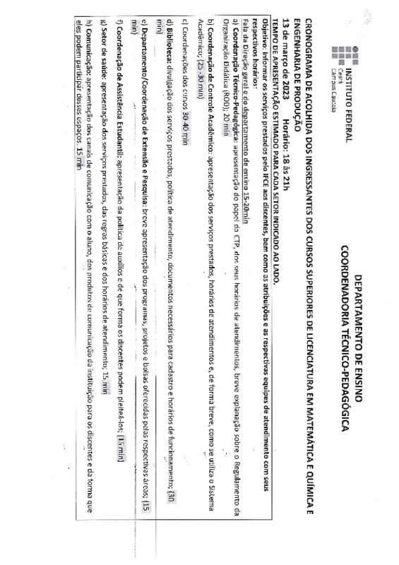 - Título alterado de Atuar no planejamento e execução do evento de acolhida dos estudantes ingressantes nos cursos ofertados pelo campus- Semestre letivo 2023. para Atuar no planejamento e execução do evento de acolhida dos estudantes ingressantes nos cursos ofertados pelo campus- Semestre letivo 2023.1