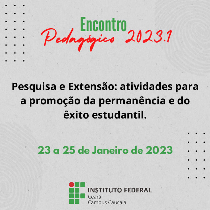 A temática do Encontro Pedagógico 2023.1 foi "Pesquisa e Extensão: atividades para a promoção da permanência e do êxito estudantil" e a programação está disponível aqui.