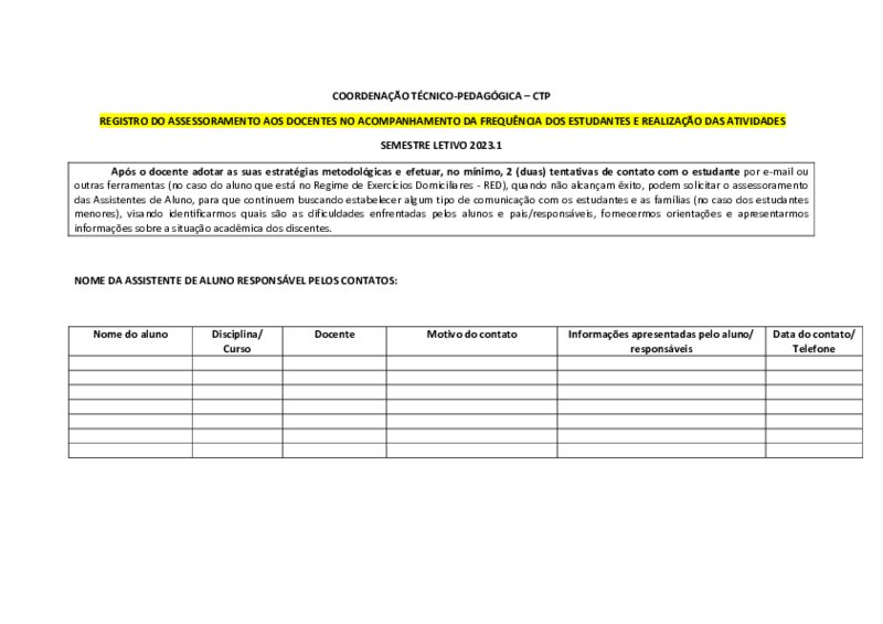 - Ao longo de todo o semestre, os servidores do setor executarão o assessoramento aos docentes e coordenadores dos cursos no acompanhamento da frequência dos alunos, realizando contatos com os discentes (pais/responsáveis, no caso de menores) que não estão frequentando às aulas ou não estão realizando as atividades, e que os professores adotaram estratégias metodológicas ou já fizeram, no mínimo, duas tentativas de contatos e não obtiveram êxito. As Assistentes de Aluno efetuarão os procedimentos cabíveis: contato com os responsáveis (e-mails e telefonemas); registros e retorno aos setores envolvidos para continuidade do acompanhamento.