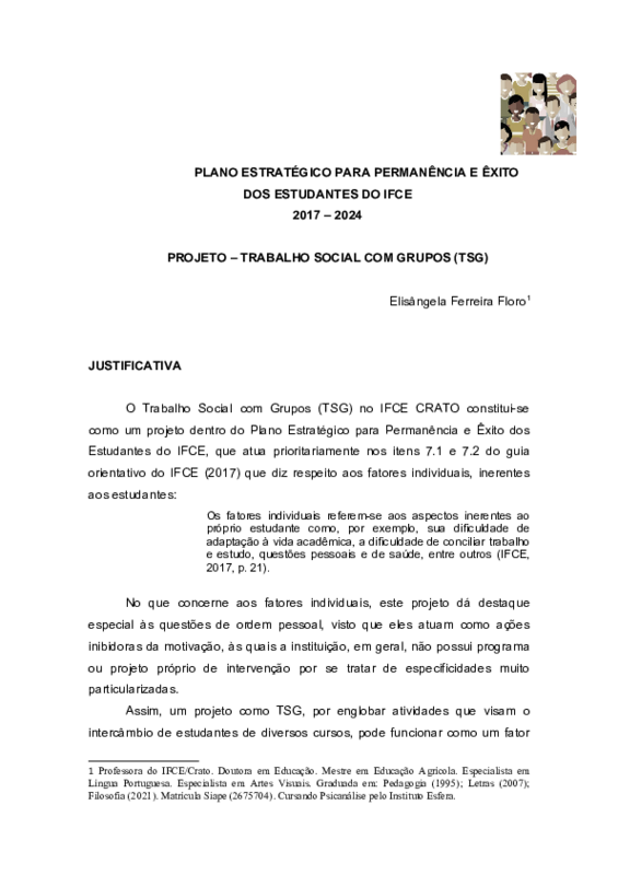 O Trabalho Social com Grupos (TSG) no IFCE CRATO constitui-se como um projeto dentro do Plano Estratégico para Permanência e Êxito dos Estudantes do IFCE, que atua prioritariamente nos itens 7.1 e 7.2 do guia orientativo do IFCE (2017) que diz respeito aos fatores individuais, inerentes aos estudantes: