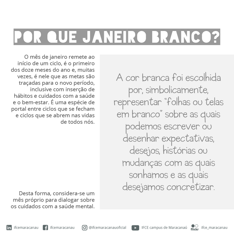 Sendo assim o Janeiro Branco foi pensada na forma de construção de cards para serem divulgados tanto nas redes sociais quanto no encontro pedagógico do Campus, visto que os alunos estavam de férias em janeiro de 2023.