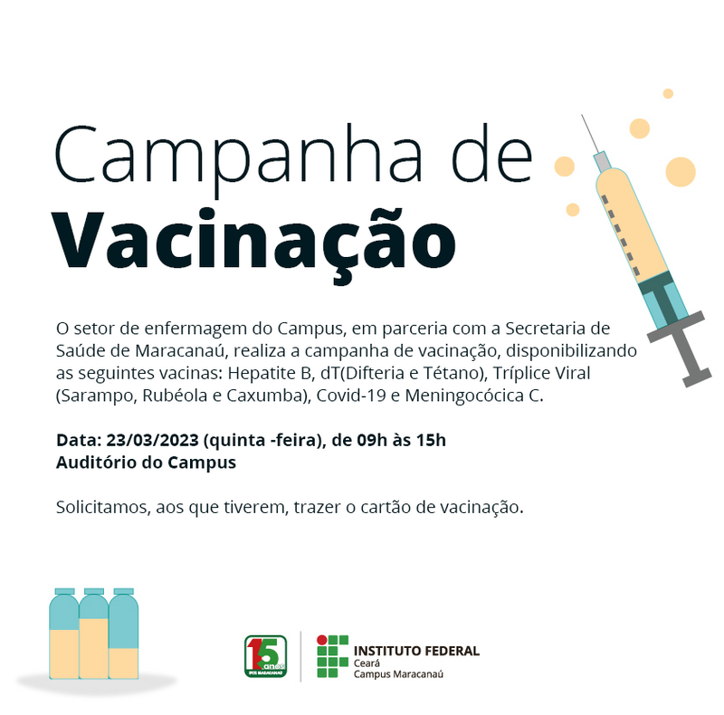 O setor de enfermagem do Campus de Maracanaú em parceria com a Secretaria de Saúde do município, realizou no dia 23/03/2023, das 9h às 15h, a campanha de atualização vacinal, onde foram disponibilizadas as vacinas: Hepatite B, dT (Difteria e Tétano); Tríplice Viral (Sarampo, Rubéola e Caxumba), Covid-19 e Meningocócica C. A campanha é destinada a toda comunidade acadêmica, que na ocasião atendeu 145 pessoas. Essas campanhas ocorrem no Espaço Cultural do Campus de Maracanaú (entrada do auditório), e são programadas para serem bimestrais.