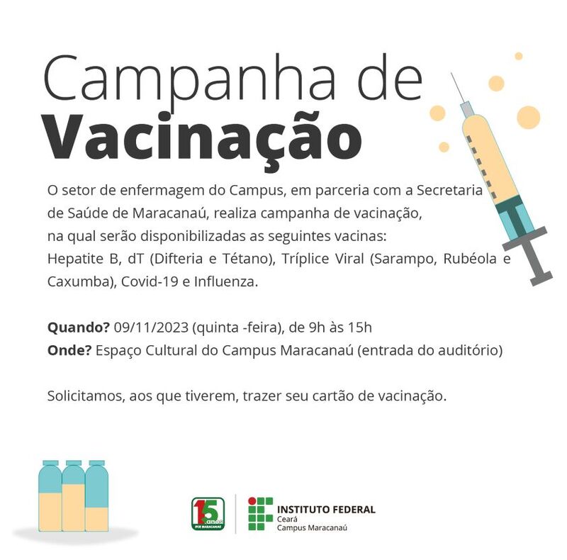 O setor de enfermagem do Campus de Maracanaú em parceria com a Secretaria de Saúde do município, realizou no dia 09/11/2023, das 9h às 15h, a campanha de atualização vacinal, onde foram disponibilizadas as vacinas: Hepatite B, dT (Difteria e Tétano); Tríplice Viral (Sarampo, Rubéola e Caxumba), Covid-19 e Influenza. A campanha é destinada a toda comunidade acadêmica, que na ocasião atendeu 31 pessoas. Essas campanhas ocorrem no Espaço Cultural do Campus de Maracanaú (entrada do auditório), e são programadas para serem bimestrais.
