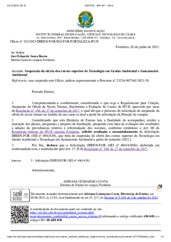 Ofício nº 183/2023/DIREN-FOR/DG-FOR/FORTALEZA-IFCE -