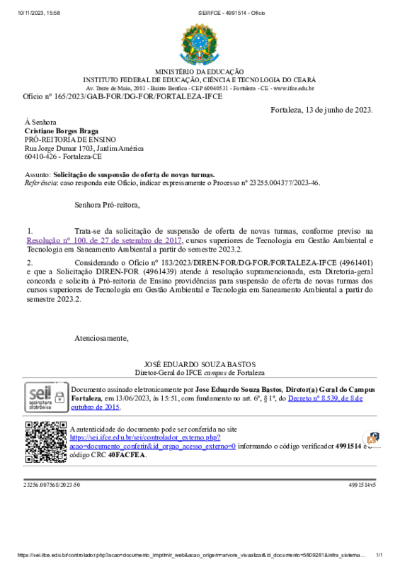 Ofício nº 165/2023/GAB-FOR/DG-FOR/FORTALEZA-IFCE