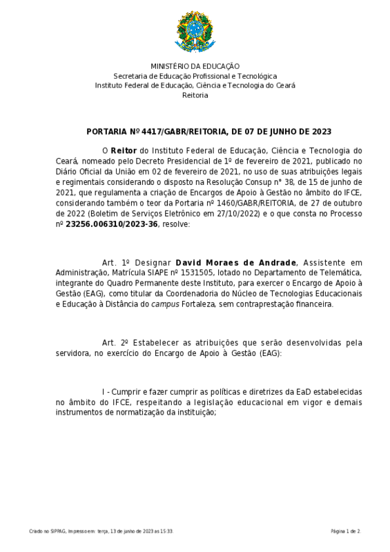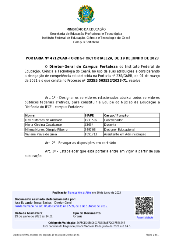 Definição da equipe de composição do Núcleo de Tecnologias Educacionais e Educação à Distância do campus Fortaleza, por meio da Portaria 4712 de 19/06/2023.