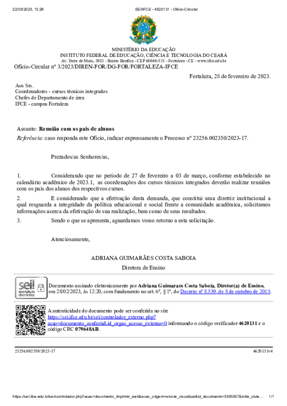 Ofício-Circular nº 3/2023/DIREN-FOR/DG-FOR/FORTALEZA-IFCE, dirigido aos coordenadores dos cursos técnico integrado, o qual recorda e pede providências quanto a realização da reunião semestral com os pais e/ou responsáveis.