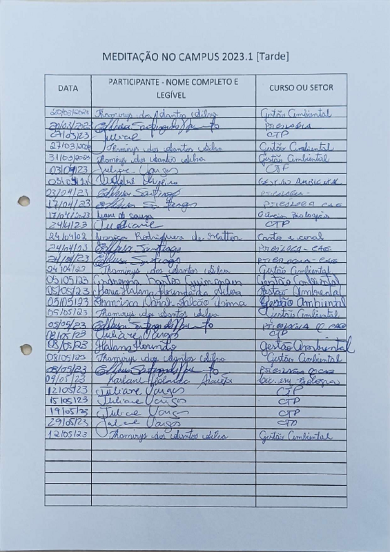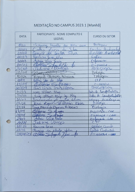 - Título alterado de Realizar o Projeto de Meditação no intervalo com os discentes para Realizar o Projeto de Meditação no intervalo com os discentes - Semestre Letivo 2023.1