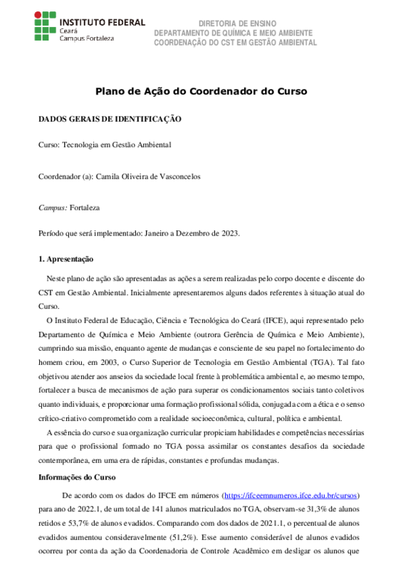 Plano de Ação da Coordenação do Curso Superior de Tecnologia em Gestão Ambiental 2023