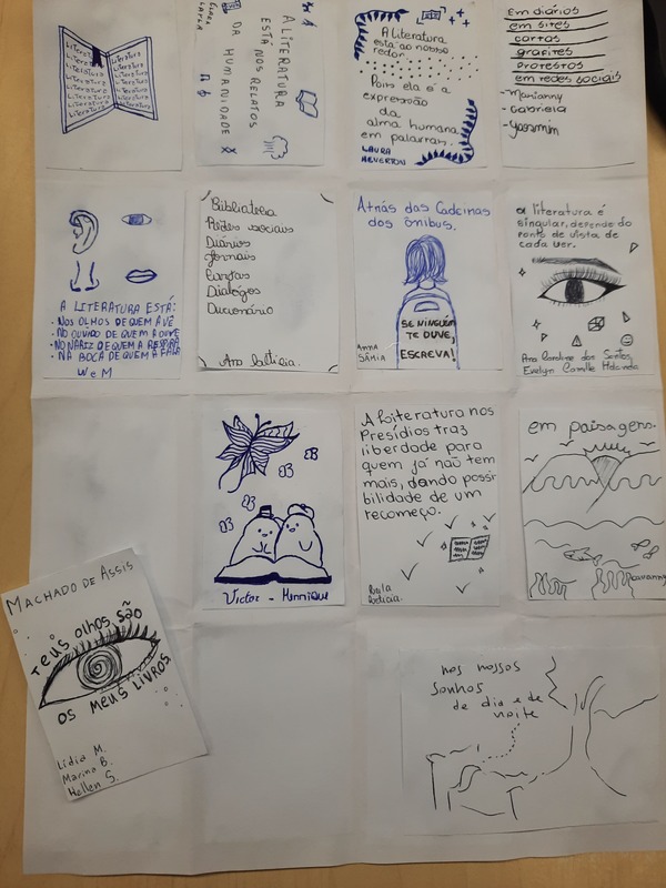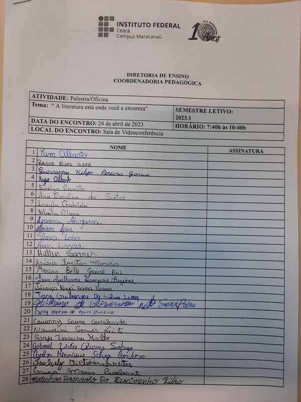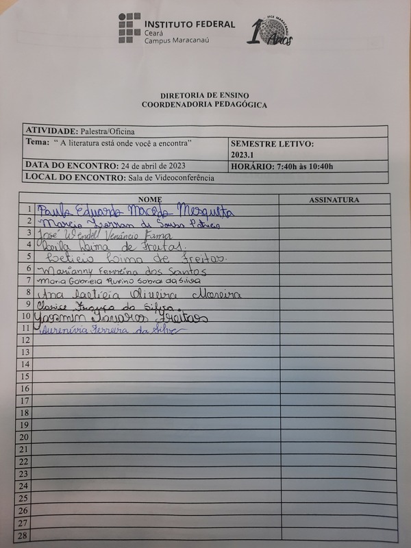 Realização da palestra/oficina "A literatura está onde você a encontra" promovida a pela Biblioteca Rachel de Queiroz, IFCE campus Maracanaú, com apoio da equipe multidisciplinar do campus em alusão ao Dia internacional do Livro. A ação foi ministrada pela multiartista Fernanda Meireles da Biblioteca Estadual do Ceará (BECE) em alusão ao Dia Internacional do Livro (23 de Abril). O evento foi realizado na sala de vídeo conferência do campus à turma do 2º ano do curso Técnico Integrado em Química, no tempo de aula da professora de literatura Aurenívia Ferreira da Silva. O evento ocorreu no dia 24 de Abril de 2023 no turno da manhã. Como resultado da oficina os participantes produziram um micro-fanzine em conjunto com o título "Onde está a literatura?".