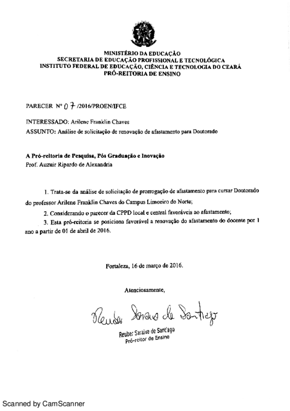 Análise de solicitação de prorrogação de afastamento para Doutorado de Arilene Franklin Chaves - Campus Limoeiro.