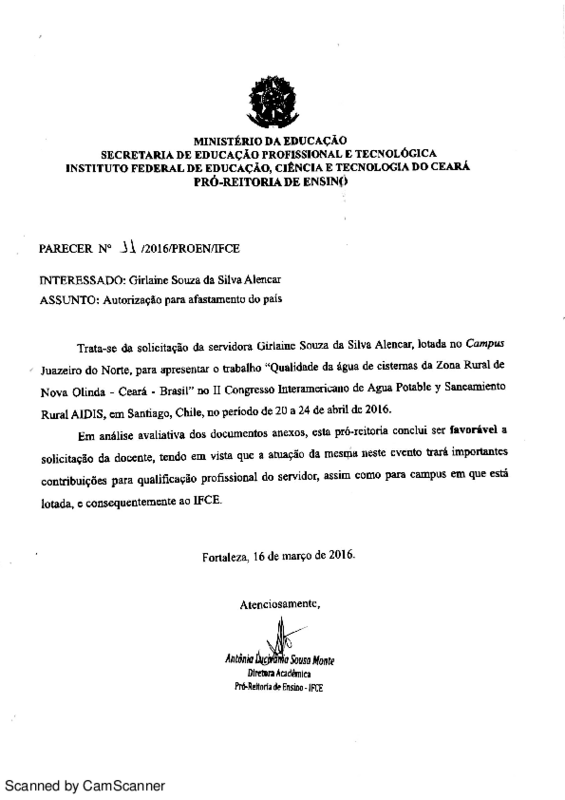 Autorização para afastamento do país de GIRLAINE SOUZA DA SILVA ALENCAR - Campus Juazeiro.