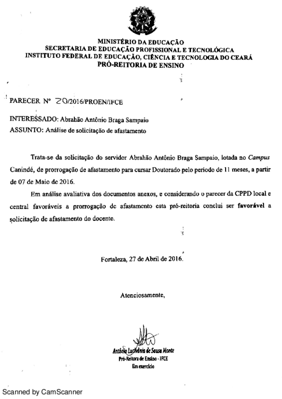 Solicitação de afastamento do servidor Abrahão Antônio Braga Sampaio do Campus Canindé para cursar Doutorado.