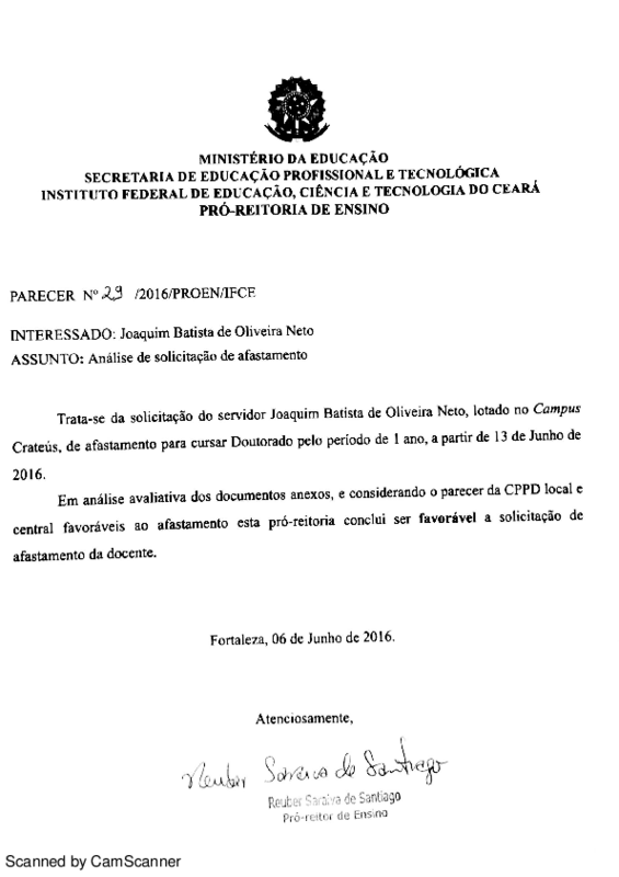 Solicitação de afastamento para cursar Doutorado do servidor Joaquim Batista de Oliveira Neto - Campus Crateús.