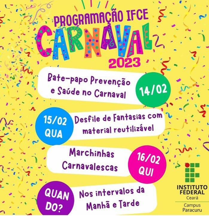 Carnaval: Carnaval - A programação de Carnaval do IFCE Campus Paracuru 2023 aconteceu nos dias 14,15 e 16 de fevereiro, nos intervalos das aulas dos turnos matutino e vespertino. As atividades foram planejadas pela CTP em parceria com discentes dos cursos técnicos e superiores, Serviço de Enfermagem (CAE), Projeto de Extensão Amigos do Mar e a professora de música do campus, Cristina Gino. A programação contou com roda de conversa e orientação sobre prevenção e saúde no Carnaval, um desfile de fantasias com materiais reutilizáveis produzidas por discentes e servidoras membros do Projeto Amigos do Mar, e apresentação de repertório musical carnavalesco, comandado pela docente de música e alunos que cantam e tocam instrumentos.