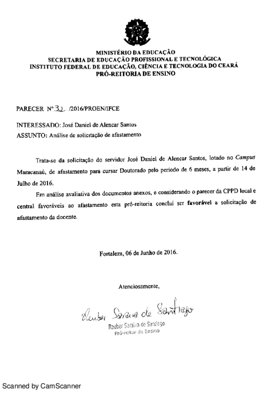 Solicitação de afastamento para cursar Doutorado do servidor José Daniel de Alencar Santos - Campus Maracanaú.
