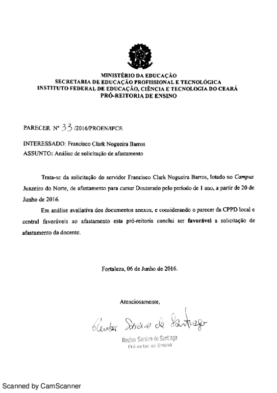 Solicitação de afastamento para cursar Doutorado do servidor Francisco Clark Nogueira Barros - Campus Juazeiro.