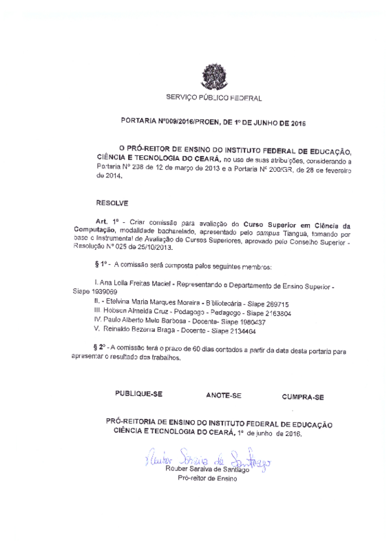 Art. 1º - Criar comissão para avaliação do Curso Superior em Ciência da Computação, modalidade bacharelado, apresentado pelo campus Tianguá, tomando por base o Instrumental de Avaliação de Cursos Superiores, aprovado pelo Conselho Superior - Resolução Nº 025 de 25/10/2013.
