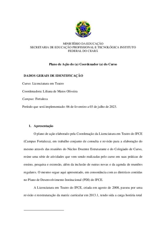 O plano de ação elaborado pela Coordenação da Licenciatura em Teatro do IFCE (Campus Fortaleza), em trabalho conjunto de consulta e revisão para a elaboração do mesmo através das reuniões do Núcleo Docente Estruturante e do Colegiado de Curso, reúne uma série de atividades que vem sendo realizadas pelo curso em suas práticas de ensino, pesquisa e extensão, além da inclusão de outras novas e da agenda de reuniões regulares. O mesmo segue aqui apresentado, em consonância com as diretrizes contidas no Plano de Desenvolvimento Institucional (PDI) do IFCE. A Licenciatura em Teatro do IFCE, criada em agosto de 2008, passou por uma revisão e reestruturação da matriz curricular em 2013.1, tendo sida a carga horária total reformada para 3.120 horas, distribuídas em oito semestres. Com a matriz atual, cujo processo de alteração e atualização realizou-se durante 2018, tendo sido aprovada no CONSUP para implementação em 2019.1, o currículo do curso passou a ter a carga horária de 3.300 horas. Em 2019, nosso PPC passou por nova atualização, atenta especialmente à aplicação das Leis 10.639/03 e 11.645/2008 nos currículos, que versam sobre a obrigatoriedade do ensino das temáticas de "História e Cultura Afro-Brasileira" e “História e Cultura Afro-Brasileira e Indígena”. O Plano de Ação tem como objetivo melhorar os indicadores do Curso, promovendo uma maior relação entre as ações de pesquisa, ensino e extensão.