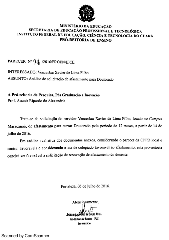 Análise de solicitação de afastamento para Doutorado de Venceslau Xavier de Lima Filho - Campus Maracanaú.