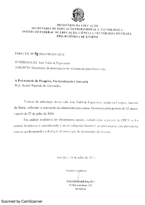 Solicitação de prorrogação de afastamento para Doutorado de José Vidal de Figueiredo - Campus Juazeiro.