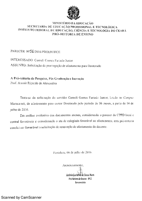Solicitação de prorrogação de afastamento para Doutorado de Corneli Gomes Furtado Júnior - Campus Maracanaú.