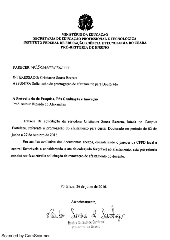 Solicitação de prorrogação de afastamento para doutorado da Professora Cristianne Sousa Bezerra - Campus Fortaleza.