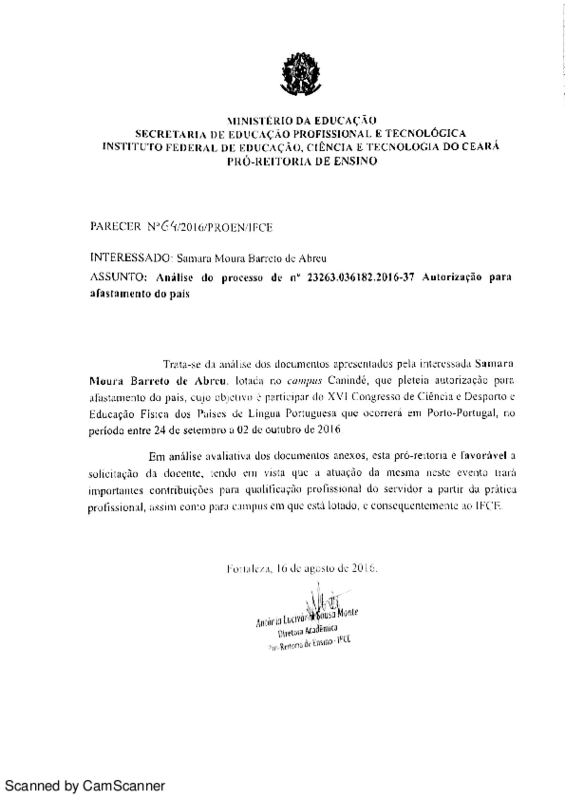 Análise do processo n° 23263.036182.2016-37: autorização para afastamento do país de Samara Moura Barreto de Abreu - Campus Canindé.