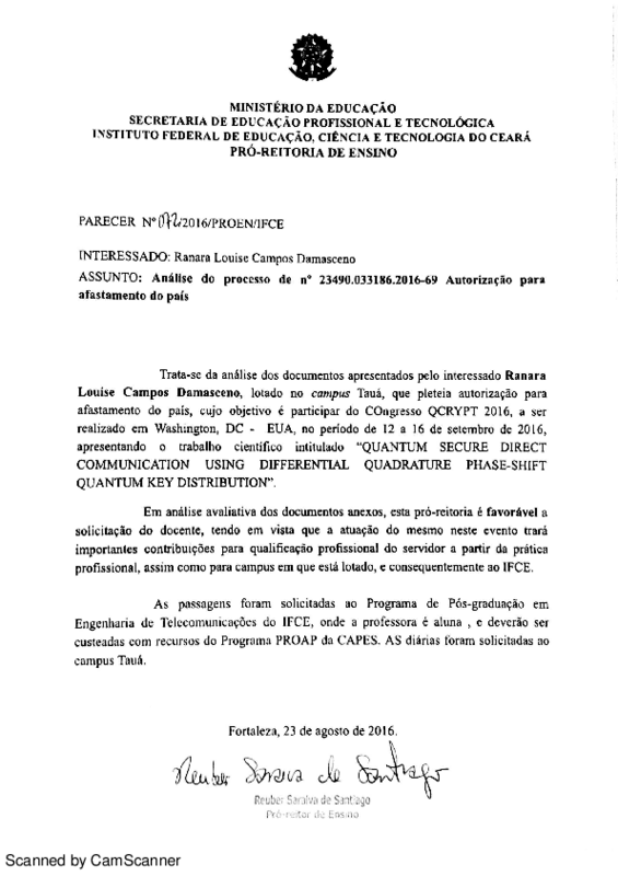 Análise do Processo n° 23490.033186.2016-69 referente autorização para afastamento do país da servidora Ranara Louise Campos Damasceno - Campus Tauá.