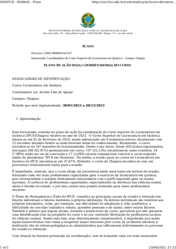 Plano de Ação do Coordenador do Curso de Licenciatura em Química 2023