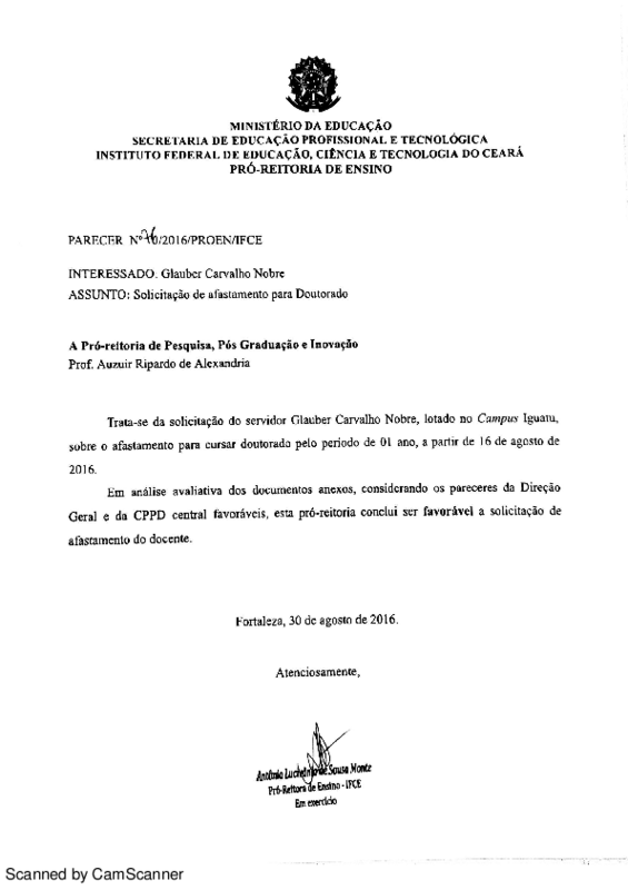 Solicitação de afastamento para Doutorado do servidor Glauber Carvalho Nobre - Campus Iguatu.
