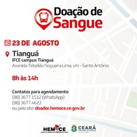 Assistência Estudantil do campus Tianguá realizará em parceria com o Hemoce a campanha de doação de sangue para coleta junto aos servidores, colaboradores e discentes. Concomitante à coleta de sangue, acontece campanha de sensibilização acerca da relevância do ato de se doar sangue, através da distribuição de panfletos, visita às salas de aula e por meio das redes sociais.