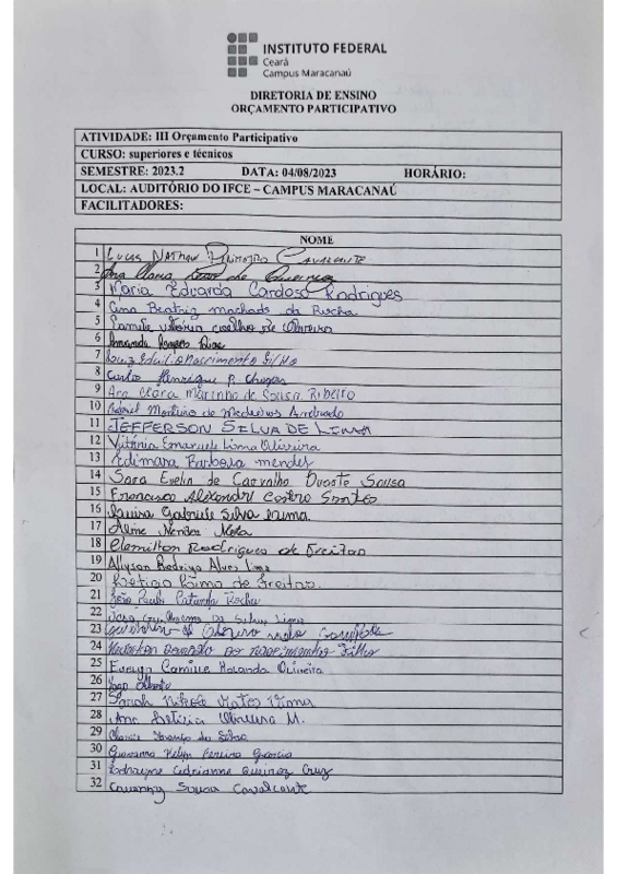 As reuniões visando ao planejamento do Orçamento Participativo no semestre 2023.2 aconteceram nos dias: 01 de agosto e 03 de agosto com participação da equipe multidisciplinar: Serviço social, psicologia, nutrição e enfermagem. No dia 24 de julho ocorreu outra reunião da CAE com DIREN, DG e CEOF do IFCE- campus Maracanaú e tinha como objetivo organizar as informações sobre o orçamento a ser repassado para os participantes do evento do dia 04 de agosto de 2021.