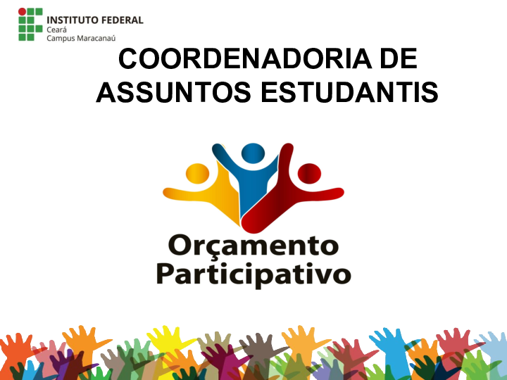 O orçamento participativo tem por objetivo publicizar o orçamento da Assistência Estudantil para a comunidade acadêmica, visando garantir condições para que docentes, técnicos administrativos e discentes decidam a melhor alocação desses recursos pautados nas demandas do campus Maracanaú.