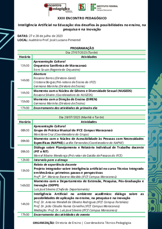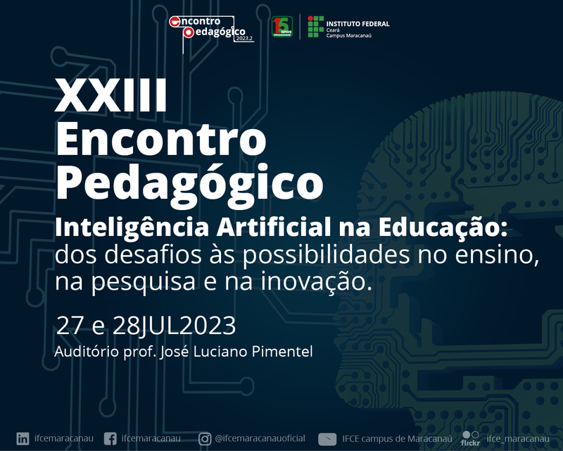 O Instituto Federal de Educação, Ciência e Tecnologia campus de Maracanaú realizará, nos próximos dias 27 e 28 de julho, o Encontro Pedagógico do semestre de 2023.2. O tema central do evento é Inteligência Artificial na Educação: dos desafios à possibilidades no ensino, na pesquisa e na inovação.