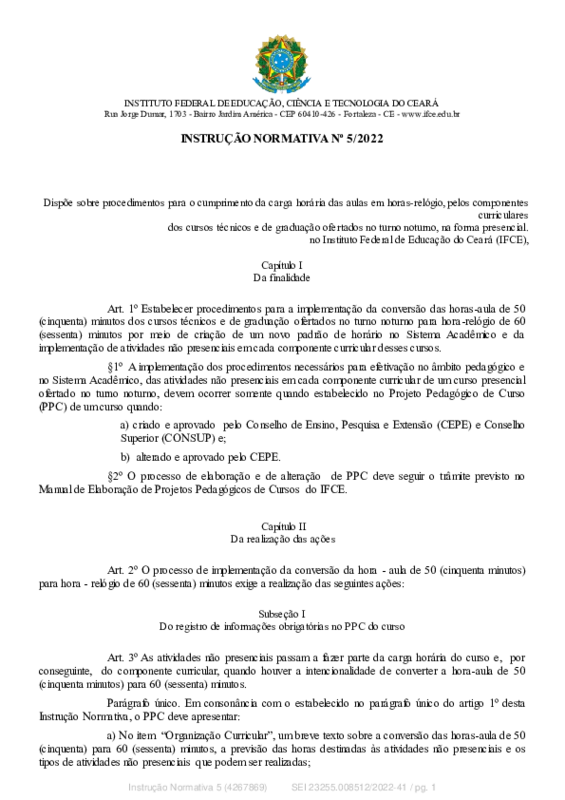 Dispõe sobre procedimentos para o cumprimento da carga horária das aulas em horas-relógio, pelos componentes curriculares dos cursos técnicos e de graduação ofertados no turno noturno, na forma presencial no Instituto Federal de Educação do Ceará (IFCE)