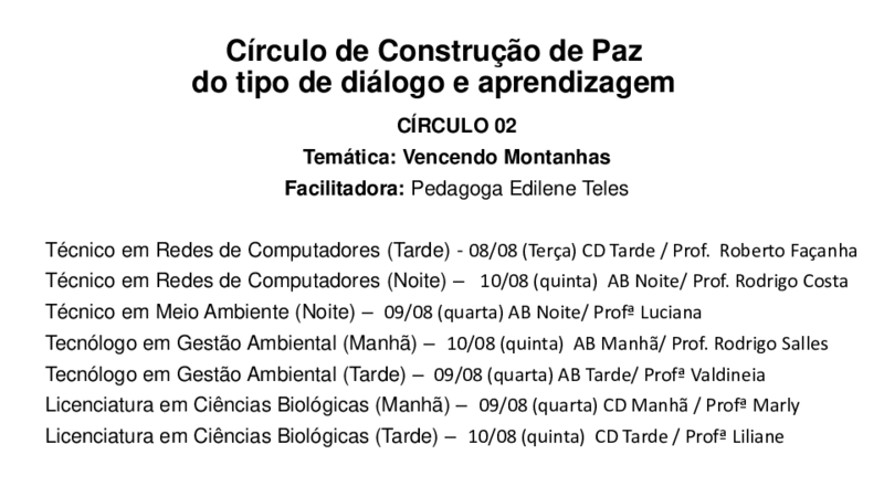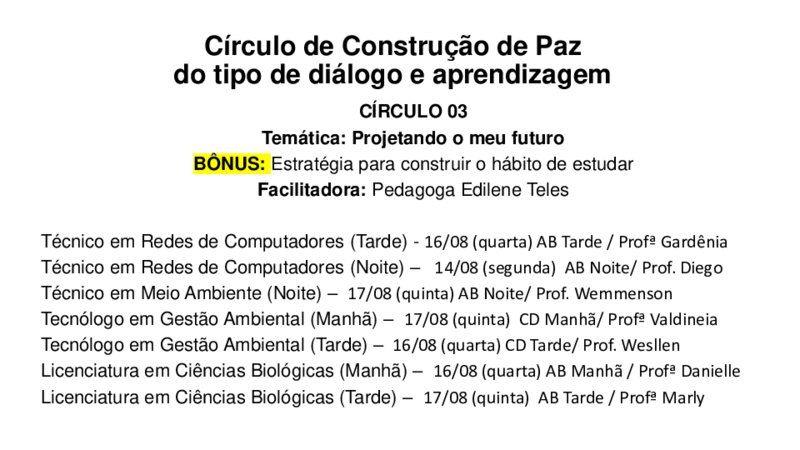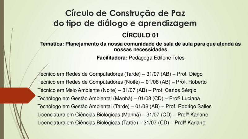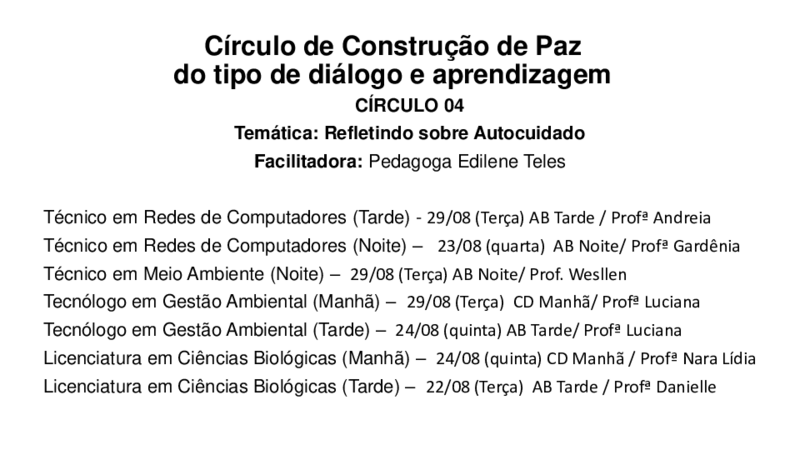 Importante destacar, que todos os Círculos de Construção de Paz acontecerão com a presença e participação de docentes (a cada semana será um docente diferente em cada turma), tendo como objetivo gerar um maior conhecimento do professor em relação à turma e isso poderá contribuir para que o planejamento docente seja mais assertivo e coerente com as necessidades dos estudantes. Além disso, os profissionais da CTP e da Assistência Estudantil também irão participar dos Círculos para uma maior aproximação dos seus setores de atuação com os alunos.