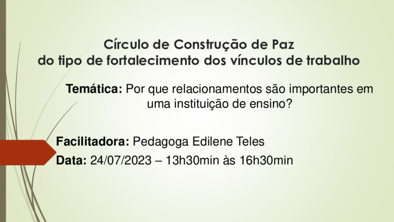 Julho/ 2023- Facilitação de Círculo de Construção de Paz, tendo como público-alvo os docentes e os Técnicos Administrativos em Educação, objetivando o fortalecimento dos vínculos de trabalho.