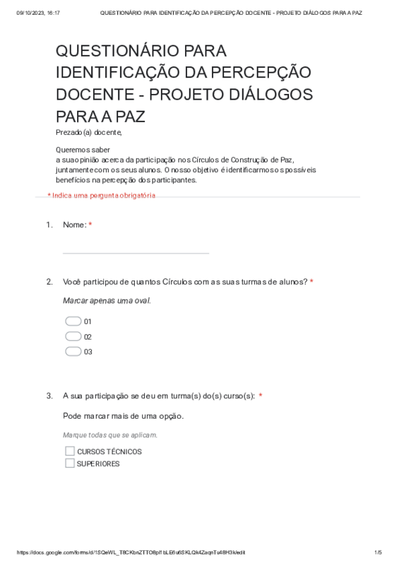 - Elaborar questionário para aplicação com alunos e docentes. O objetivo do questionário aplicado com os alunos é tentar identificar se há alguma relação entre a participação dos alunos nos Círculos de Construção de Paz e a permanência deles no curso. Quanto ao questionário aplicado com os docentes, objetiva perceber se a participação deles nos Círculos de Construção de Paz contribuiu para o fortalecimento da relação deles com os estudantes e para o planejamento mais inclusivo e voltado para as necessidades dos alunos.