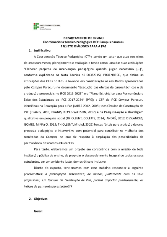 O objetivo geral do projeto Diálogos para a Paz é propiciar aos estudantes matriculados nos cursos técnicos e de graduação, a participação em espaços seguros para o exercício do diálogo, visando à construção do sentimento de pertença e o fortalecimento dos vínculos entre alunos/alunos e alunos/docentes, objetivando uma repercussão positiva nos índices de permanência estudantil do IFCE Campus Paracuru.