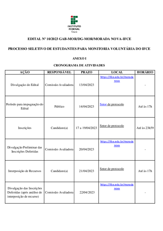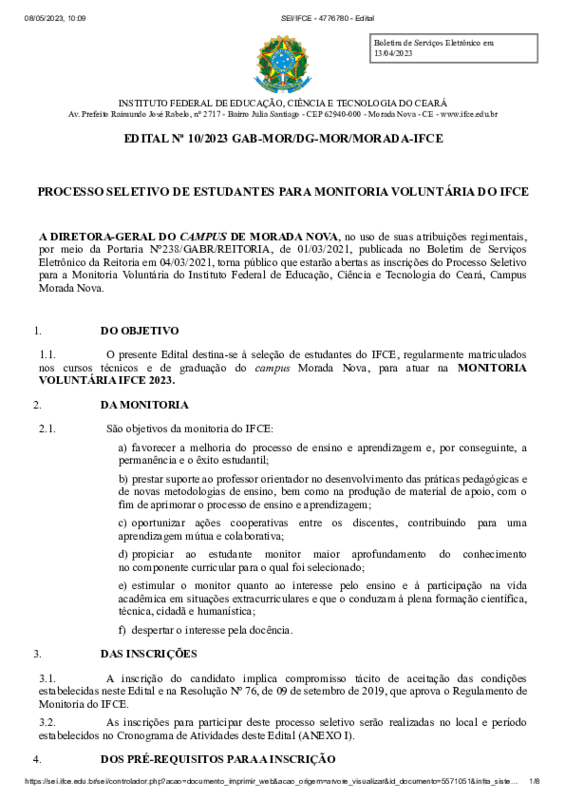 Publicar o EDITAL Nº 10/2023 GAB-MOR/DG-MOR/MORADA-IFCE para o PROCESSO SELETIVO DE ESTUDANTES PARA MONITORIA VOLUNTÁRIA DO IFCE.