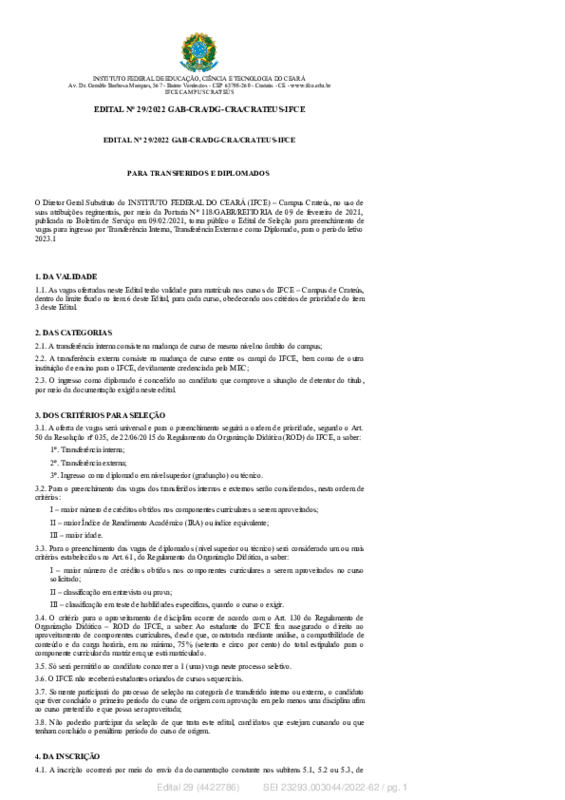 EDITAL Nº 29/2022 para ingresso por Transferência Interna, Transferência Externa e como Diplomado 2023.1