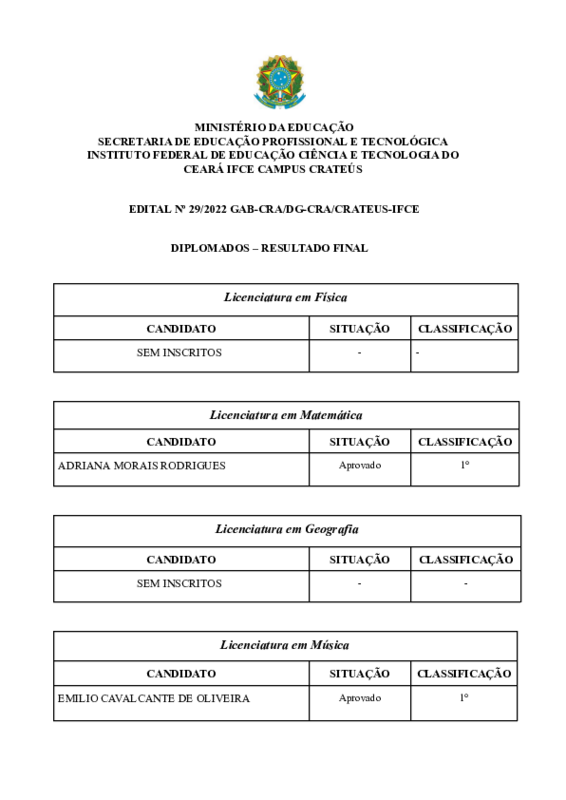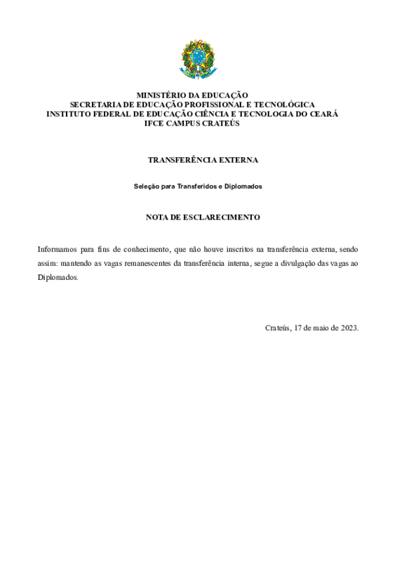 As vagas ofertadas neste Edital terão validade para matrícula nos cursos do IFCE – Campus de Crateús,