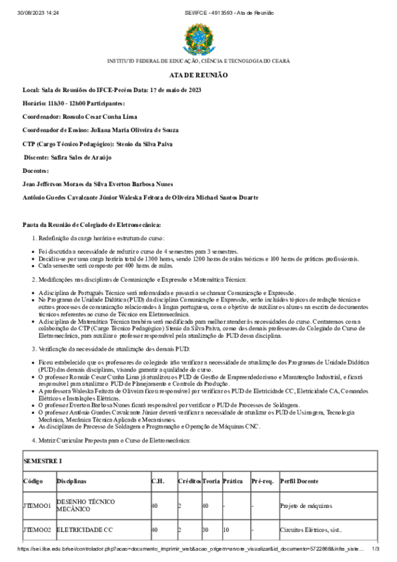 Resumo da Pauta da Reunião de Colegiado de Curso Técnico em Eletromecânica