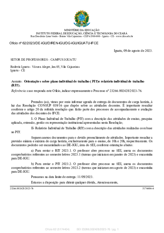 Acompanhar o Plano Individual de Trabalho (PIT) e Relatório Individual de Trabalho (RIT) dos docentes semestralmente e a partir destes fazer os ajustes necessários. Relação aluno x professor.