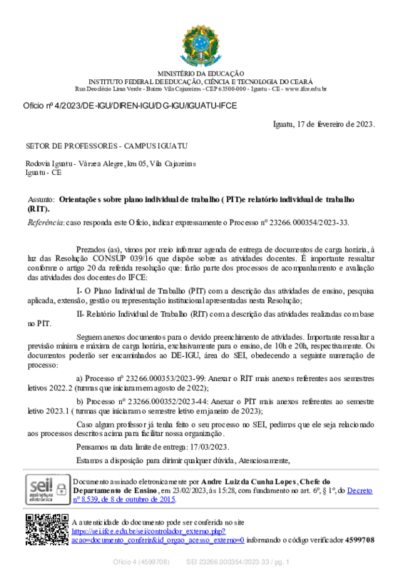 Acompanhar o Plano Individual de Trabalho e Relatório Individual de Trabalho, observando a relação de quantidade carga horária docente x aluno