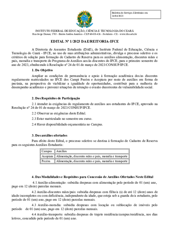 Oferta e pagamento dos auxílios estudantis: moradia, transporte, alimentação e discentes pais e mães